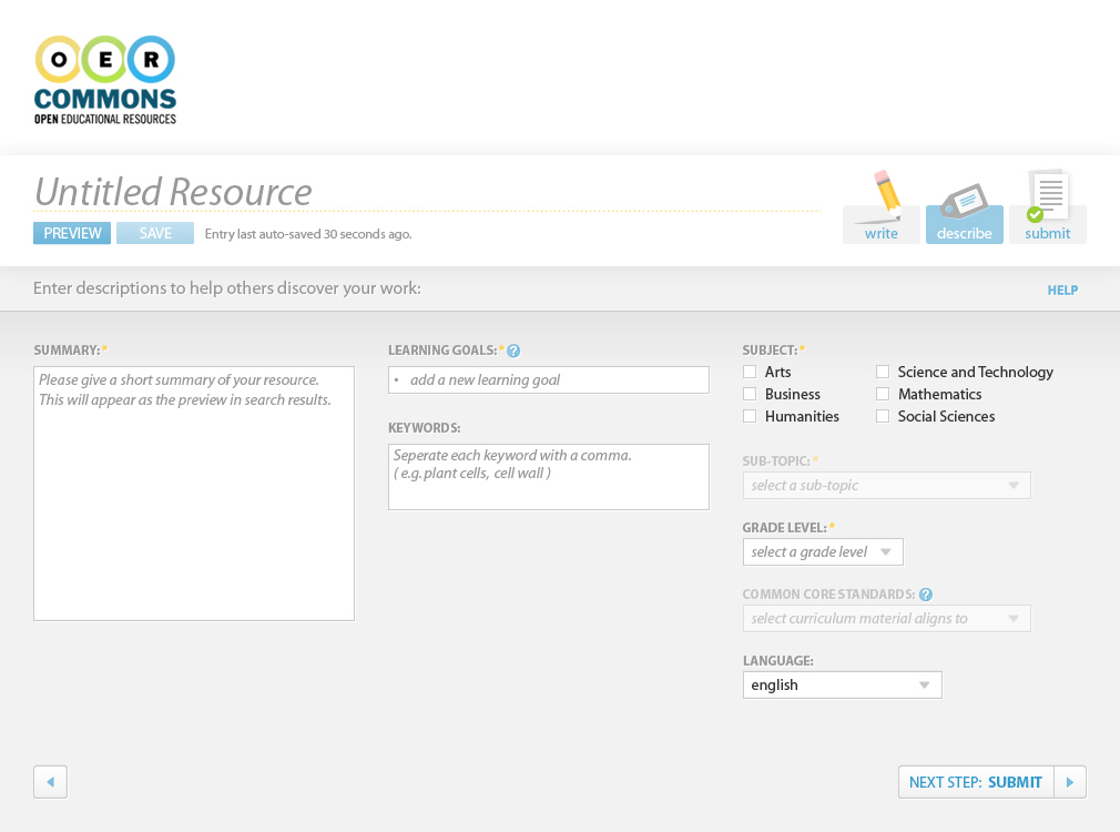 Figure 2: Floe/OER Commons authoring environment, metadata input screen.